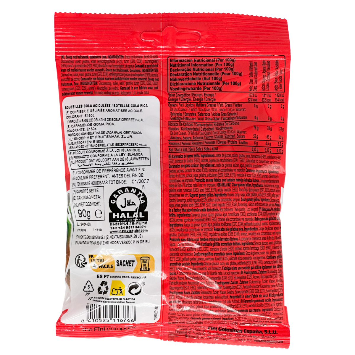 Diese sauren Cola‑Fläschchen sind intensive Geschmacksexplosionen in Mini‑Format: außen gezuckert und sauer, innen weich und voll Colaaroma. Der Fini Cola Fizz bringt prickelnde Süße mit einem Hauch Säure – perfekt für alle, die Cola in Bonbonform wollen.