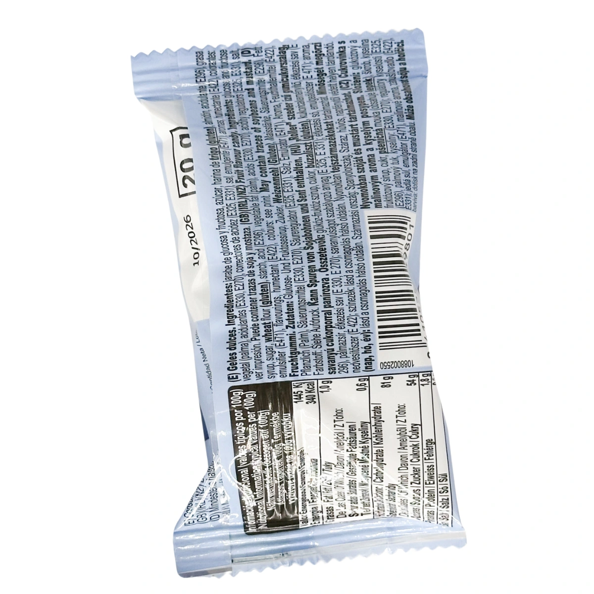 Zutaten: Glucose‑Fructose‑Sirup, Zucker, Weizenmehl (GLUTEN), Stärke, Säuerungsmittel (E296), pflanzliches Fett (Palm), Säuren (E330, E270), Säureregulatoren (E325, E331), Salz, Emulgator (E471), Feuchthaltemittel (E422), Aromastoffe, Farbstoffe. Kann Spuren von SOJA und SENF enthalten.