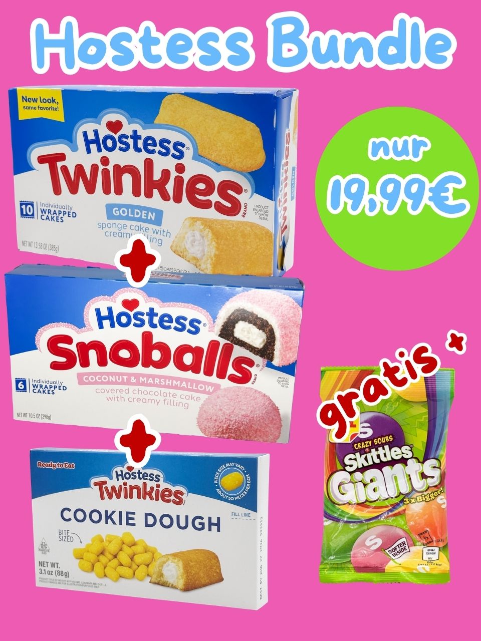 Inhalt: 1 Bundle bestehend aus 1x Hostess Twinkies Vanilla 10er Pack, 1x Hostess Snoballs 6er Pack, 1x Hostess Twinkies Cookie Dough 88 g und 1x Skittles Giants Crazy Sours 116 g als kostenlose Beigabe