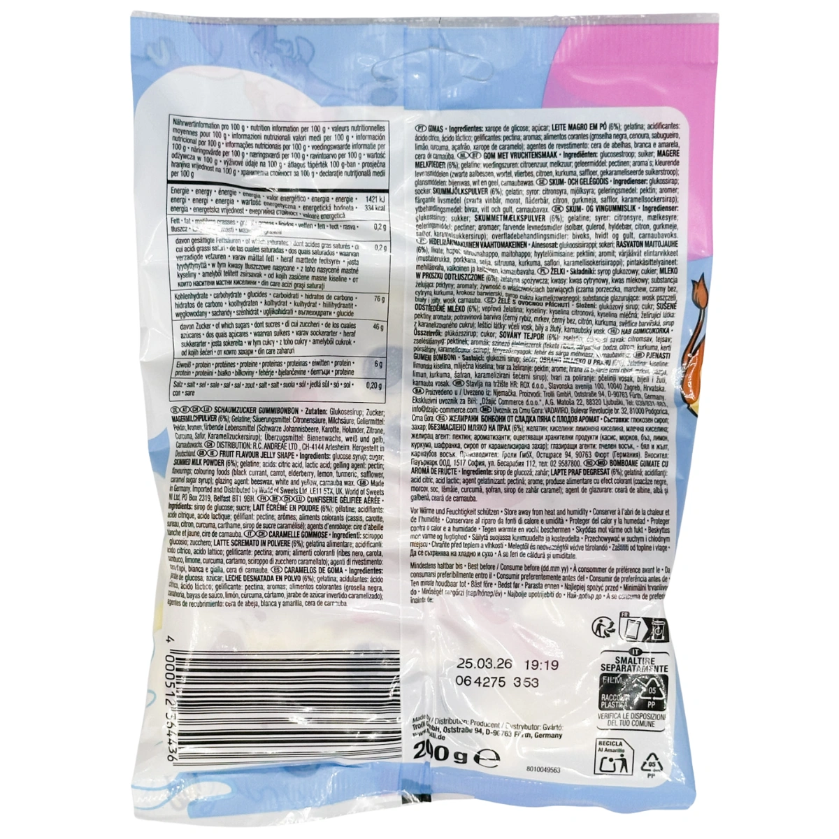 Zutaten: Glukosesirup; Zucker; Magermilchpulver (6 %) ; Gelatine; Säuren (Citronensäure, Milchsäure); Geliermittel (Pektin); Aromen; Farbstoffe (Schwarze Johannisbeere, Karotte, Holunder, Kurkuma, Saflor, Zitrone, Karamellzuckersirup); Überzugsmittel (Bienenwachs weiß & gelb, Carnaubawachs)