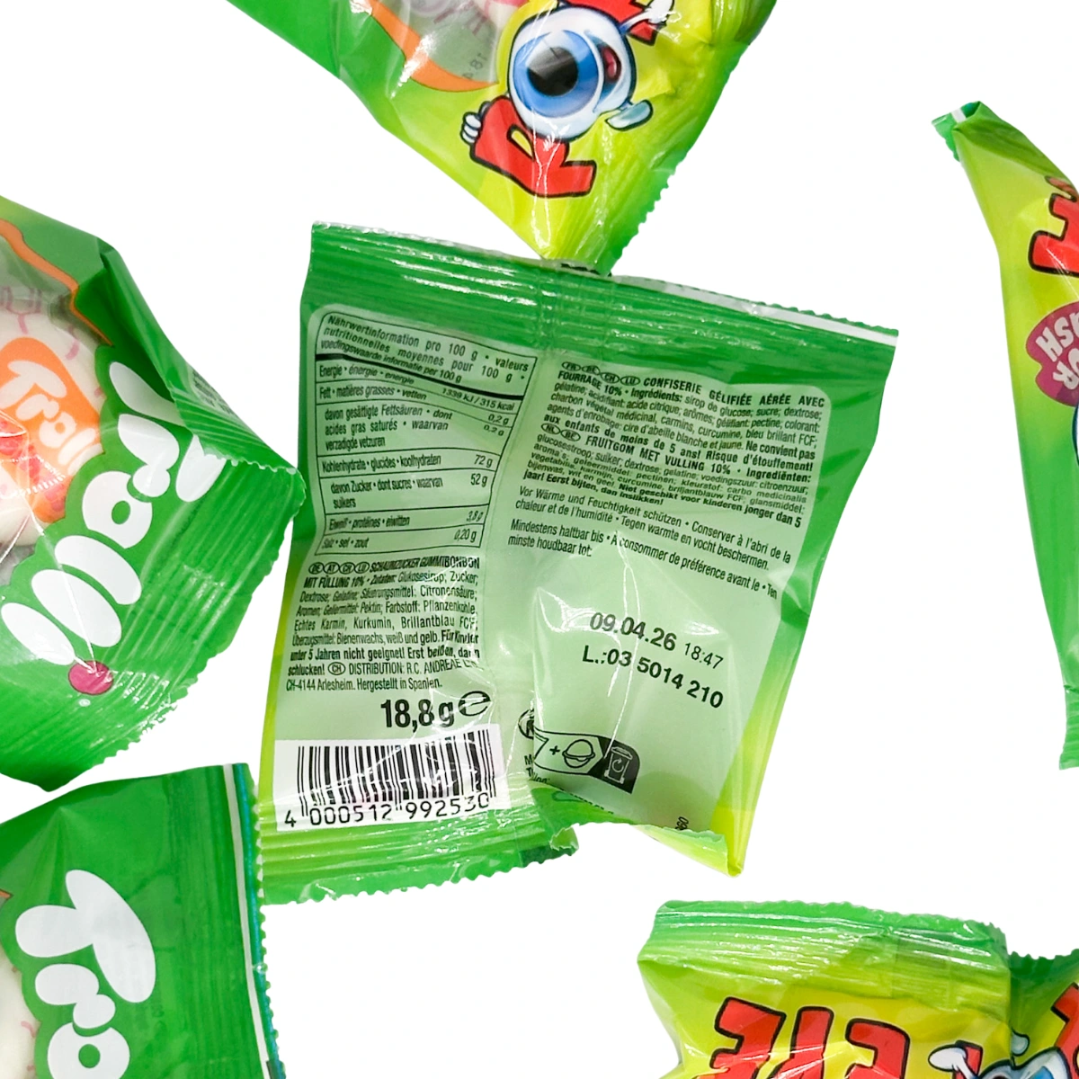 Trolli Pop Eye sind 3D‑Gummibonbons in Augenform mit saurer, flüssiger Füllung – zuerst knusprig außen, dann kommt die Überraschung im Inneren. Ein Highlight für Halloween, Partys oder alle, die Süßes mit Schockfaktor mögen.